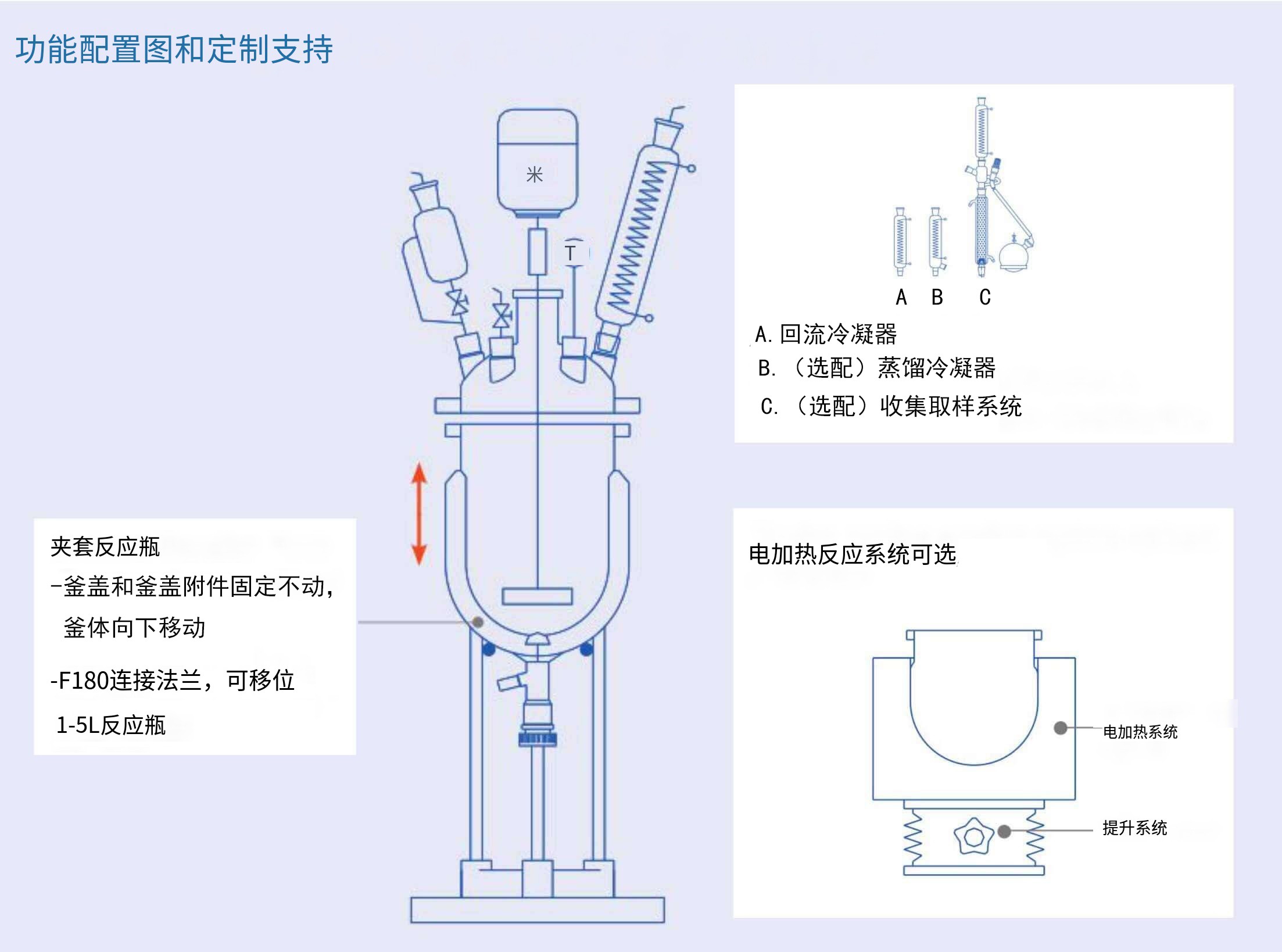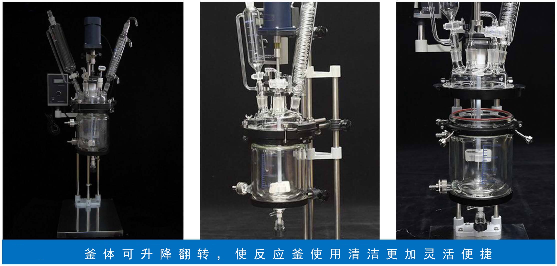 夾套玻璃反應釜具有向下開啟功能,請看下面的雙層玻璃反應釜功能配置圖,幫助您更清楚地了解這類玻璃反應釜的詳細資訊: